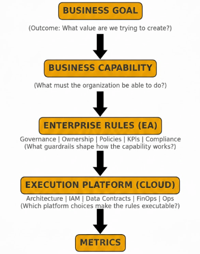 If cloud engineers and architects build the digital infrastructure, Enterprise Architecture (EA) defines what that infrastructure must enable and why